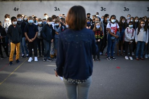 | Des enfants portant un masque écoutent une enseignante dans un établissement scolaire de Vincennes, à l'est de Paris, le 1er septembre. |