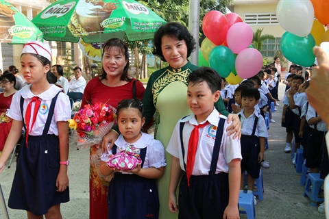 | La vice-présidente de l'Assemblée nationale, Nguyên Thi Kim Ngân (2e plan, à droite), à la rentrée scolaire du l'école primaire Nguyên Huê. |