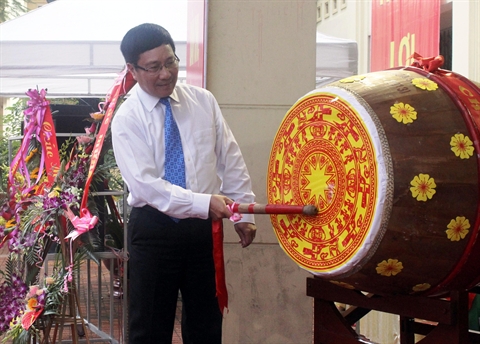 | Le vice-Premier ministre Pham Binh Minh frappe le tambour pour inaugurer la nouvelle année scolaire 2015-2016 au collège Câm Pha, dans la province de Quang Ninh (Nord) |