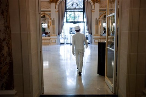 | Un groom à l'entrée de l'hotel de luxe Peninsula à Paris. |