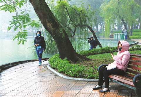 | Touristes au bord du lac de Hoàn Kiêm (lac de l’Épée restituée) à Hanoï. |