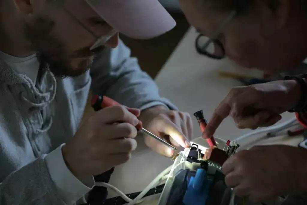 Pince ou tournevis en main, les débutants se font aider par les plus expérimentés, n'hésitant pas à leur poser des questions pour comprendre le fonctionnement d'une électrovanne, ou la différence entre un watt et un volt.