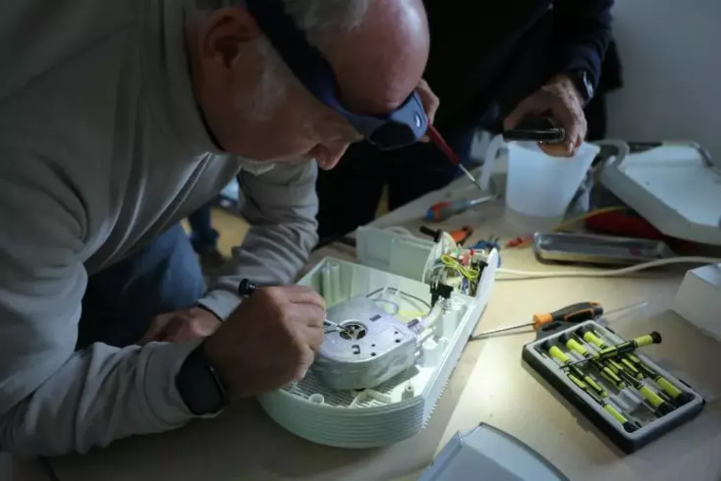 Après quelques tests au multimètre, cet ingénieur électronique à la retraite est catégorique: "C'est la pompe, elle n'aspire plus l'eau", explique-t-il à Hélène, une passionnée de couture qui participe pour la première fois à un "repair café", un concept d'atelier de réparation collaboratif et gratuit né à Amsterdam en 2009.