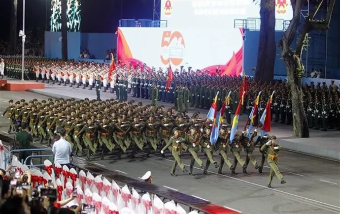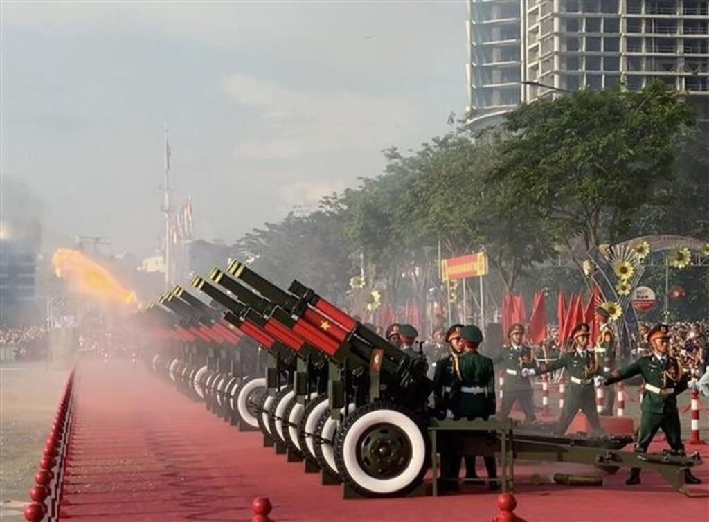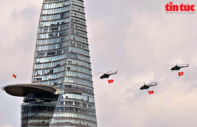 Le défilé a débuté par le survol du centre d'Hô Chi Minh-Ville par un escadron d'hélicoptères arborant les drapeaux du Parti et de l'État, accompagné d'avions de chasse de l'Armée populaire vietnamienne.