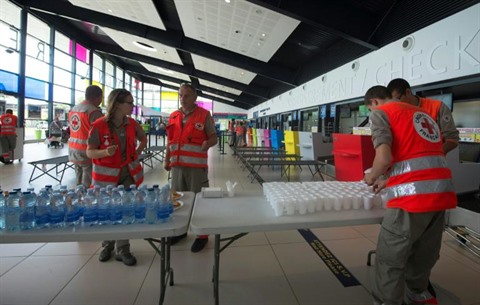 | Des membres de la Croix-Rouge à Pointe-à- Pitre préparent des boissons pour les familles évacuées depuis l'île de Saint-Martin ravagée par l'ouragan Irma, le 9 septembre. |