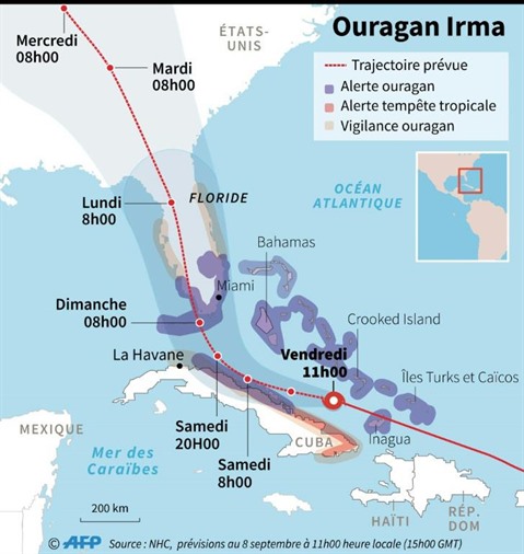| Prévisions de la trajectoire de l'ouragan Irma dans les Caraïbes. |
