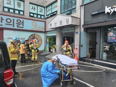 | Les secouristes déployés à l'hôpital à Icheon, en République de Corée où survient l'incendie le 5 août. |