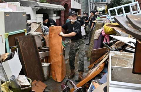 | Des soldats évacuent les enchevêtrements de meubles et débris dans une zone résidentielle de Séoul, après des pluies torrentielles, le 10 août. |