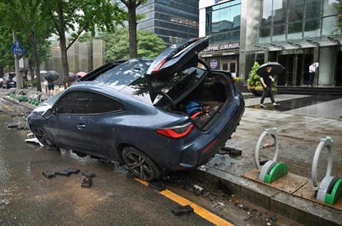 | Un véhicule endommagé dans une rue de Séoul après des pluies torrentielles, le 9 août. |