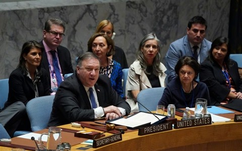| Le chef de la diplomatie américaine Mike Pompeo, qui présidait une réunion du Conseil de sécurité de l'ONU sur la République démocratique populaire de Corée en marge de l'Assemblée générale annuelle des Nations unies, le 27 septembre à New York. |