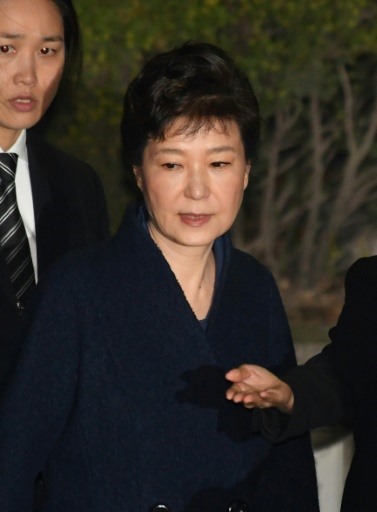 L'ancienne chef de l'État de 65 ans a regardé droit devant elle, tentant apparemment de rester impassible, tandis qu'elle était conduite peu avant l'aube au Centre de détention de Séoul sous les flashes des photographes.