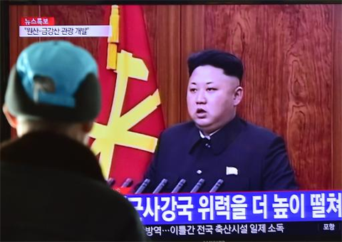 | Le dirigeant de la RPDC, Kim Jong-Un lors de son traditionnel message télévisé du Nouvel An suivi sur un écran dans une gare à Séoul le 1er janvier 2015. |