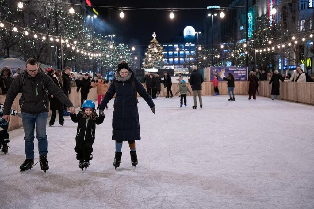 | Des gens patinent sur une patinoire installée dans un marché de Noël à Prague, en République tchèque, le 29 novembre 2025. |