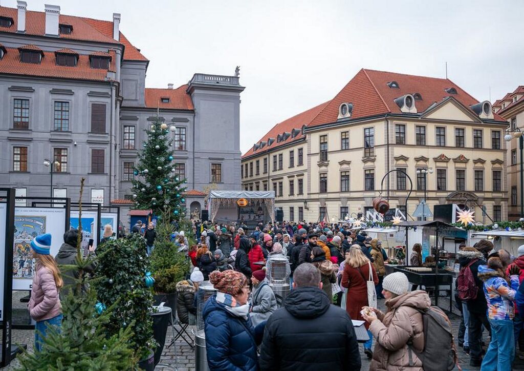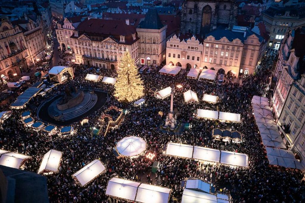 | Des visiteurs se promènent dans un marché de Noël à Prague, en République tchèque, le 29 novembre 2025. |