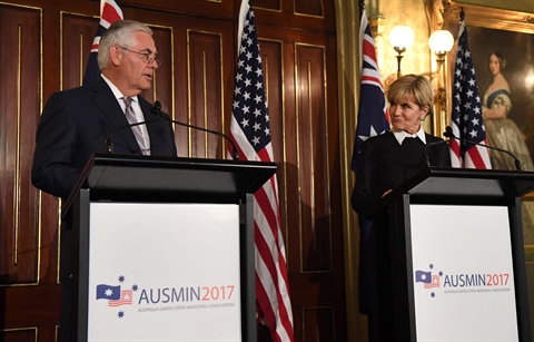 | Le secrétaire d'État américain Rex Tillerson et son homologue australienne Julie Bishop, le 5 juin à Sydney |