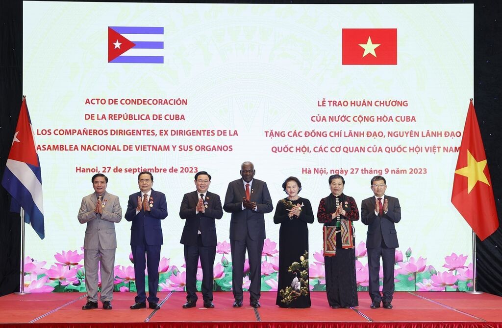Le même jour, Vuong Dinh Huê et Esteban Lazo Hernández ont assisté à la cérémonie de remise de nobles Ordres de l'État cubain à sept dirigeants et anciens dirigeants de l'Assemblée nationale et des commissions de l’Assemblée nationale du Vietnam pour reconnaître et honorer leurs importantes contributions à la promotion des relations entre les deux pays et entre les deux organes législatifs.