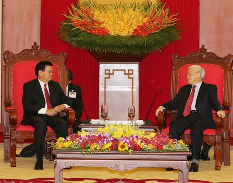 | Le secrétaire général du PCV, Nguyên Phu Trong (droite), s'entretient avec le Premier ministre lao, Thongloun Sisoulith, le 16 mai à Hanoi. |