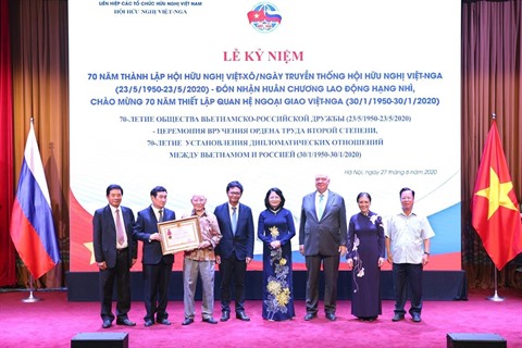 Présente à l’événement, la vice-présidente de la République, Dang Ngoc Thinh, a remis l’Ordre du Travail de 2e classe à l’Association d’amitié Vietnam - Russie pour ses réalisations remarquables dans la mise en œuvre de projets de paix, de solidarité et d'amitié, contribuant à la promotion de la diplomatie populaire entre le Vietnam et la Russie.