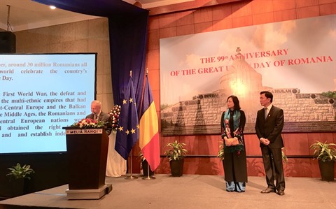| L’ambassadeur de Roumanie au Vietnam, Valeriu Arteni, prend la parole à la célébration de la 99e Fête nationale de la Roumanie, le 28 novembre à Hanoï. |