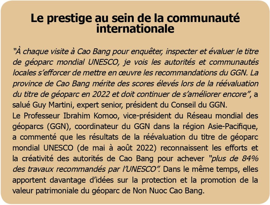 De nos jours, les autorités locales et le comité de gestion du géoparc de Non Nuoc Cao Bang continuent d’investir dans le infrastructures et de promouvoir le tourisme... Sans oublier de guider et former les habitants de la zone patrimoniale du géoparc à faire du tourisme communautaire associé aux villages d’artisanat traditionnels et aux produits OCOP (One Commune One Product - À chaque commune son produit).