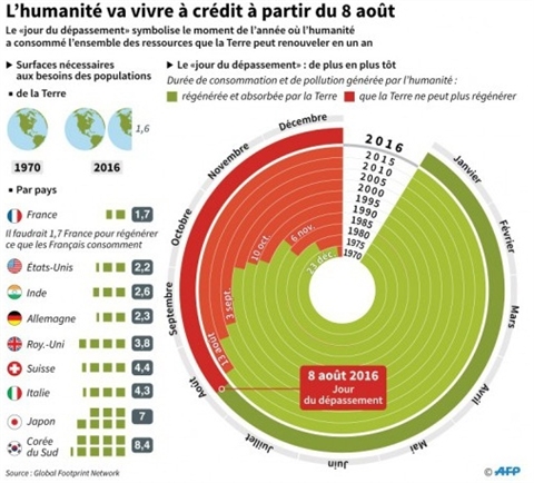 Le 8 août marque pour la Terre le "jour du dépassement" ("earth overshoot day" en anglais). À partir de cette date, "nous vivons donc à crédit", écrivent Global Footprint et le WWF dans un communiqué.
