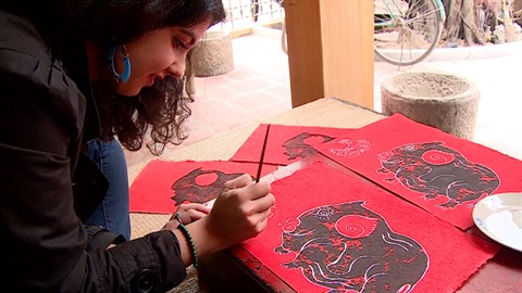 Au village de Kim Hoàng, Sarah Vallée peut observer le travail minutieux de l’artisan. Elle est aussi invitée à réaliser ses propres estampes, sous les conseils avisés d’un artisan. Une expérience inoubliable pour cette jeune femme.