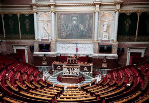 | La tapisserie "L'école d'Athènes" dans l'hémicycle de l'Assemblée nationale en mai 2020. |