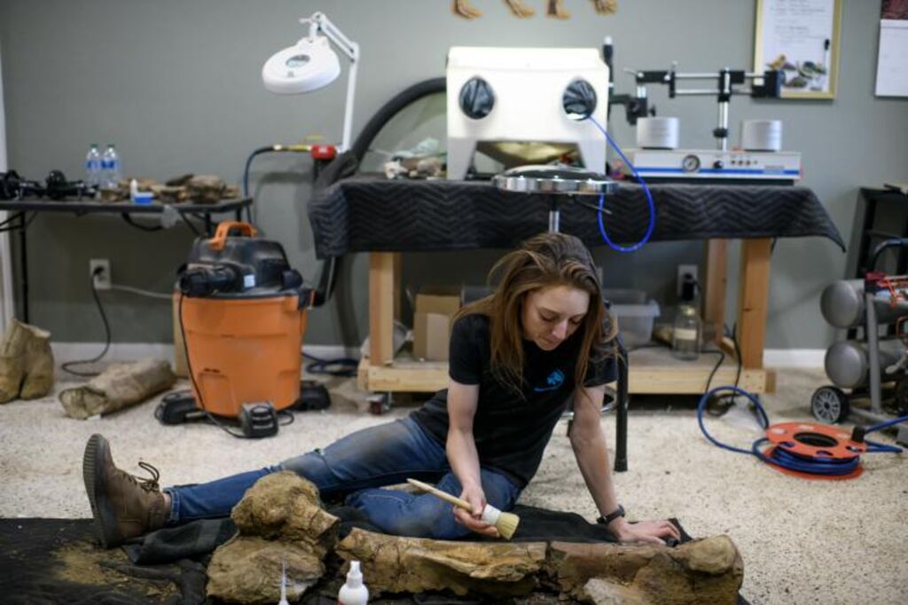 Dans son atelier installé à domicile, au nord-est de Houston (Texas), cette restauratrice américaine utilise une sorte de mini-perceuse connectée à un compresseur, un peu comme un outil de dentiste, pour retirer avec une extrême précaution des particules de terre de fossiles dépassant les 60 millions d'années.