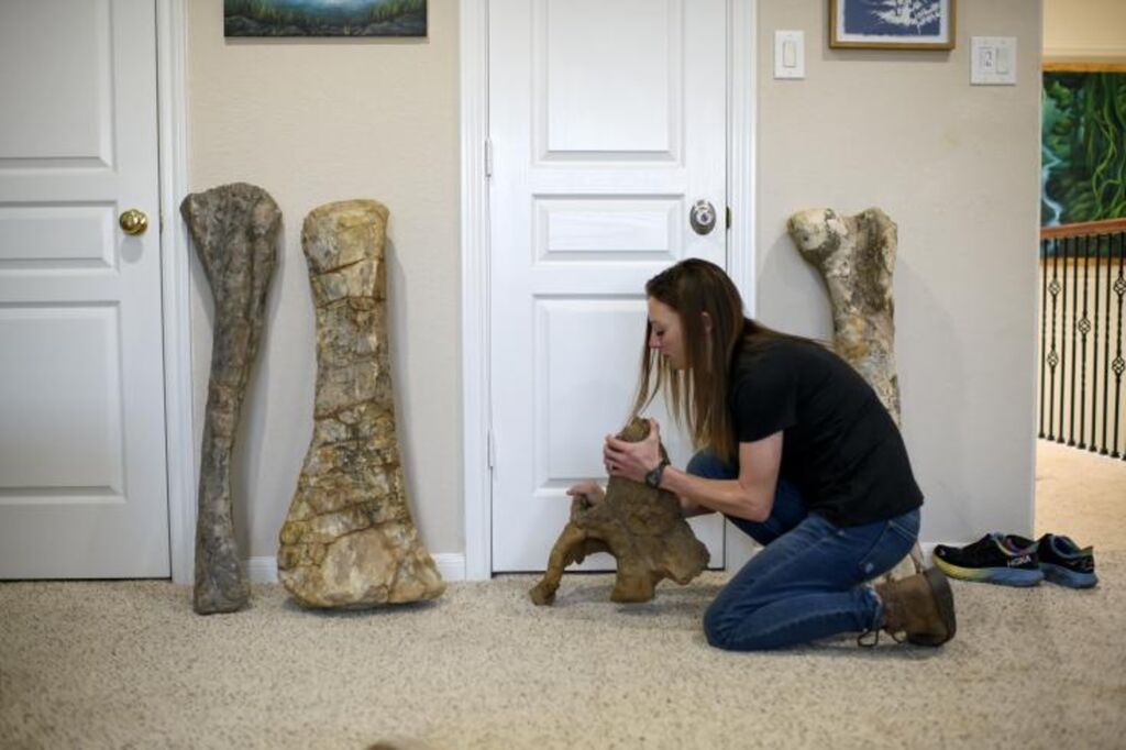 | La restauratrice américaine Lauren McClain tient un fossile de Tricératops dans son atelier près de Houston, le 30 avril. |