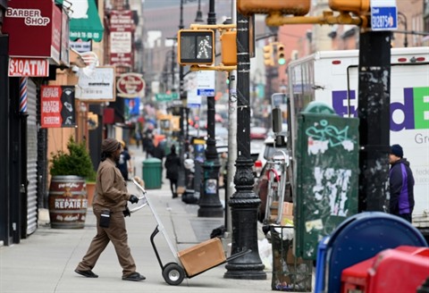 | Un livreur de colis dans ue rue désertée de Brooklyn à New York le 20 mars 2020. |