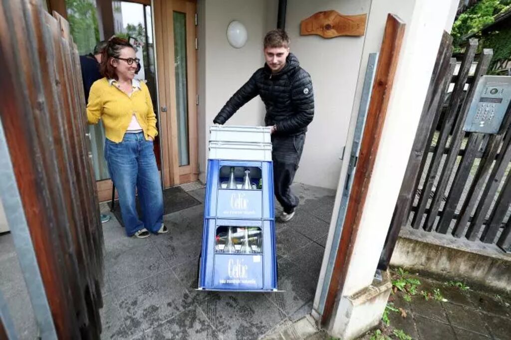 Dans un immeuble du centre de Strasbourg, Antonin gravit les étages une caisse dans chaque main. Il vient livrer 23 bouteilles d'eau en verre à Christine Pfeiffer et Jean-Marc Faudi, 66 ans. En échange il repart avec le même nombre de bouteilles vides, qui une fois lavées, pourront être réutilisées.