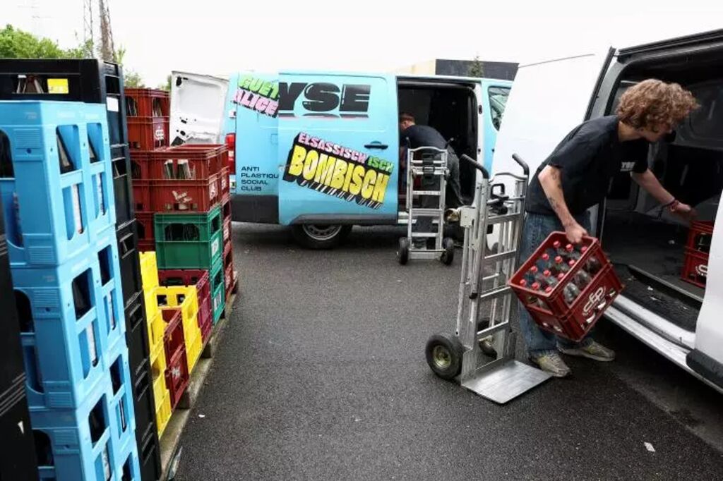 | Un employé de la société YSE livre des bouteilles de boissons en verre et récupère celles qui sont vides le 23 avril à Strasbourg. |