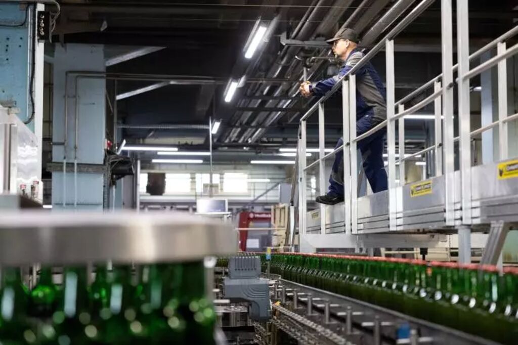 | Un employé de la brasserie Meteor à Hochfelden, près de Strasbourg, surveille la chaîne d'embouteillage le 25 mars. |
