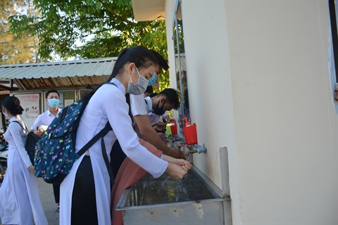 | Lycéens de Cà Mau (Sud) se lavant les mains avant d’entrer en classe. |