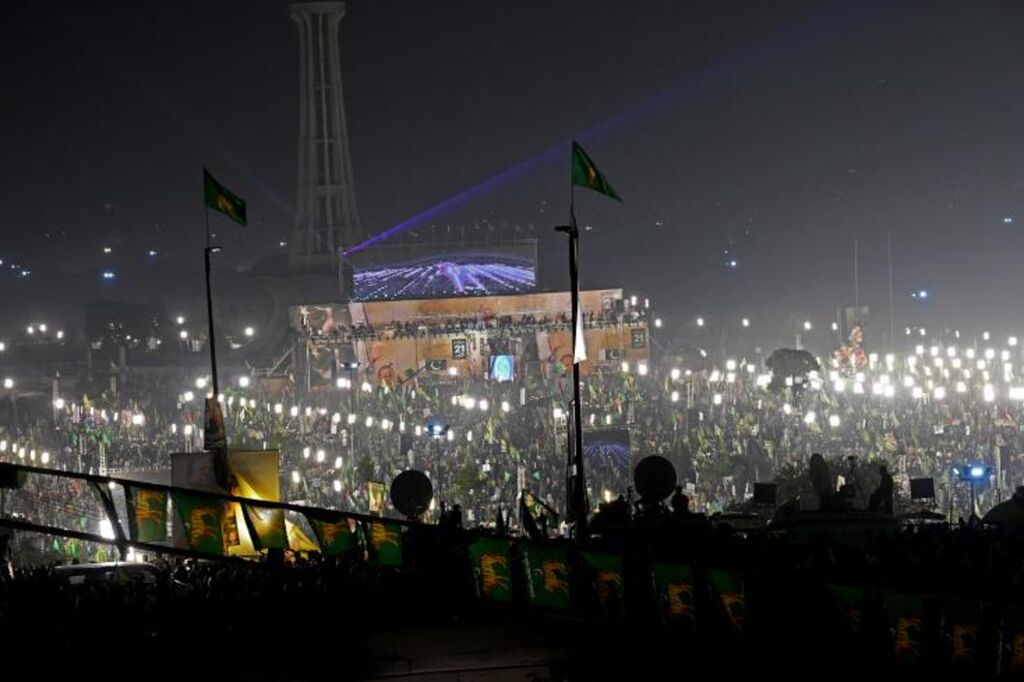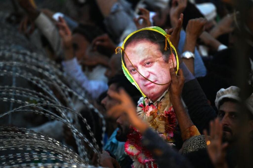 Des dizaines de milliers de ses supporteurs ont envahi en fin d'après-midi le parc Iqbal de Lahore, au milieu d'une marée de drapeaux verts décorés d'un tigre orangé, pour voir Nawaz Sharif, 73 ans, revenir en scène.