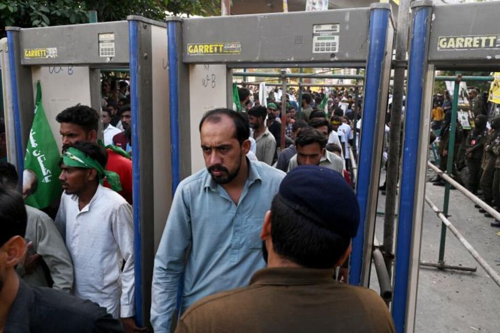 | Des partisans de l'ancien Premier ministre pakistanais de retour d'exil, Nawaz Sharif, passent les portiques de sécurité avant un vaste meeting, le 21 octobre à Lahore. |