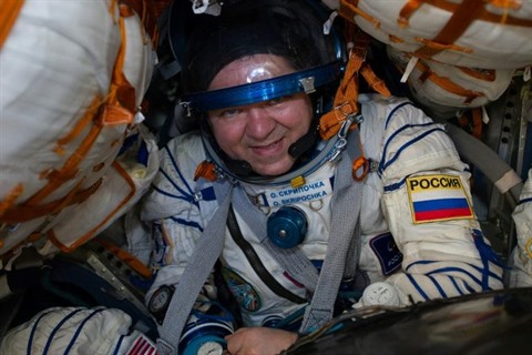 | Photo diffusée par l'Agence spatiale russe Roscosmos du cosmonaute russe Oleg Skripotchka dans la capsule Soyouz lors du retour sur Terre de l'équipage de l'ISS, le 17 avril à Jezkazgan, au Kazakhstan. |