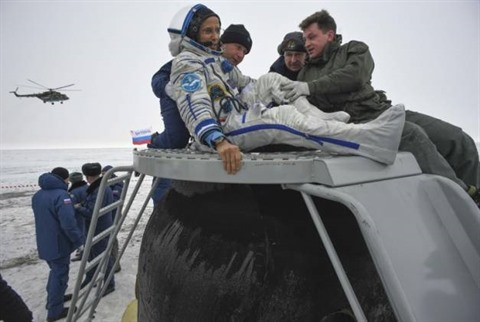 | L'astronaute américain Joe Acaba sort de la capsule spatiale après un atterrissage dans la steppe kazakhe, au sud-est de la ville de Jezkazgan, le 28 février. |