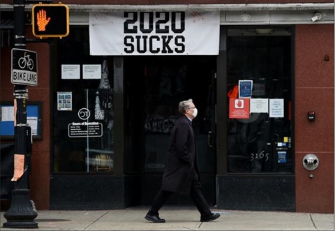 | Un homme portant un masque passe devant un restaurant orné d'une bannière "2020 craint", le 18 décembre 2020 à Arlington, en Virginie (États-Unis). |