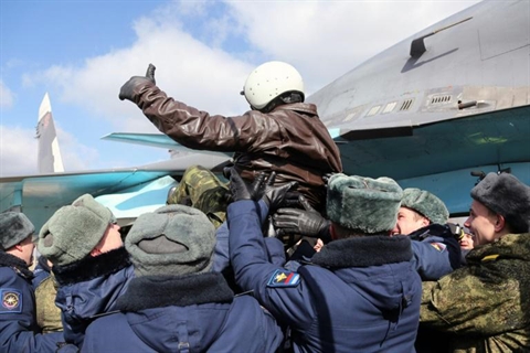 | Photo fournie par le ministère russe de la Défense montrant un pilote de l'armée de l'air de retour de Syrie, salué par ses collègues sur la base aérienne de Voronezh à 580 km au sud-est de Moscou le 15 mars |