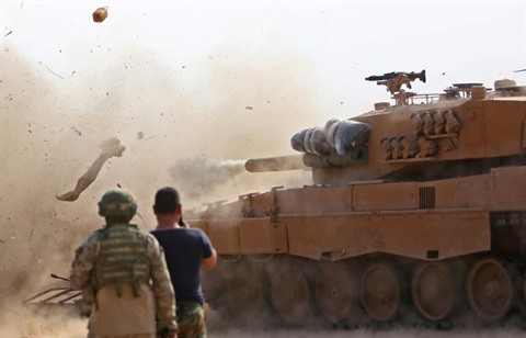 | Des soldats turcs observent un char de leur armée tirer sur des positions d'une milice kurde, à Ras al-Aïn (Nord de la Syrie), le 28 octobre. |