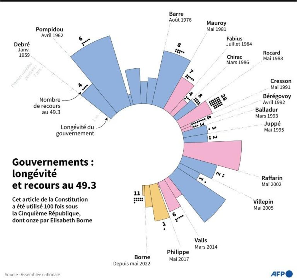 | Graphique montrant la longévité des gouvernements et leurs recours au 49.3 sous la Cinquième République en France. |