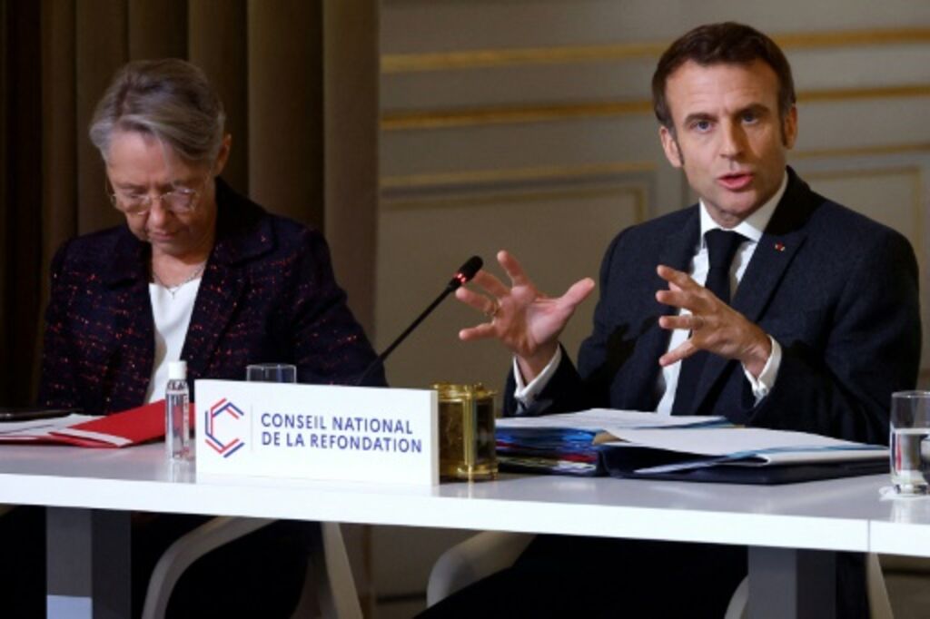| Élisabeth Borne et Emmanuel Macron lors de la deuxième session plénière du Conseil national de la refondation à l'Élysée, le 12 décembre à Paris. |
