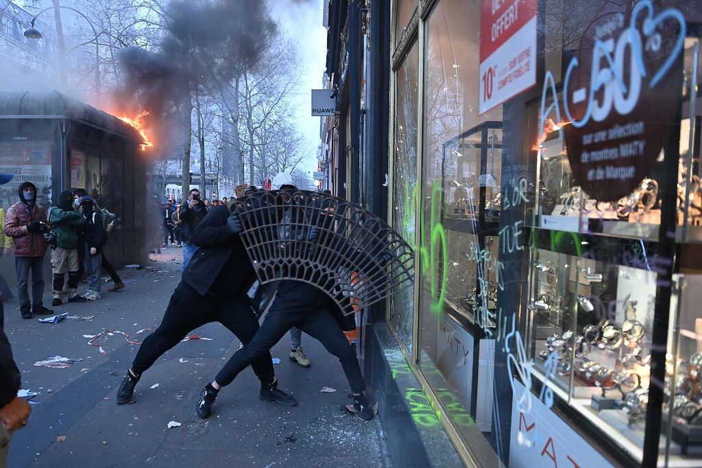 | Des manifestants cassent la vitrine d'une boutique en marge d'une mobilisation contre la réforme des retraites, le 23 mars à Paris. |