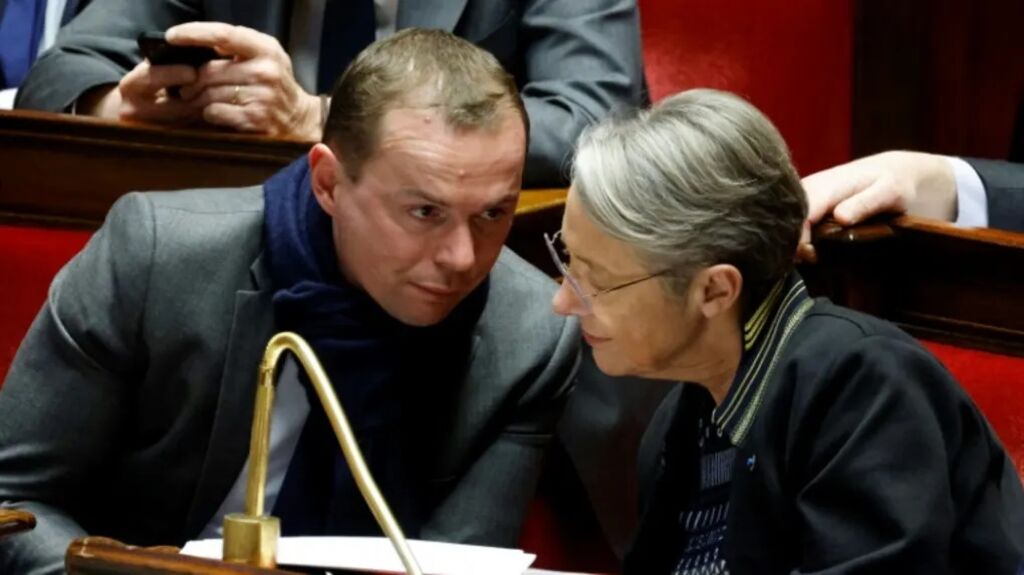 | La Première ministre Elisabeth Borne et le ministre du Travail, Olivier Dussopt, le 18 février à l'Assemblée nationale. |