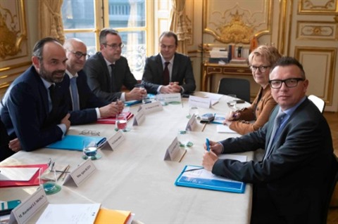 | Réunion de travail de membres du gouvernement avec Édouard Philippe le Premier ministre (gauche), à l'hôtel Matignon, sur la réforme des retraites. |