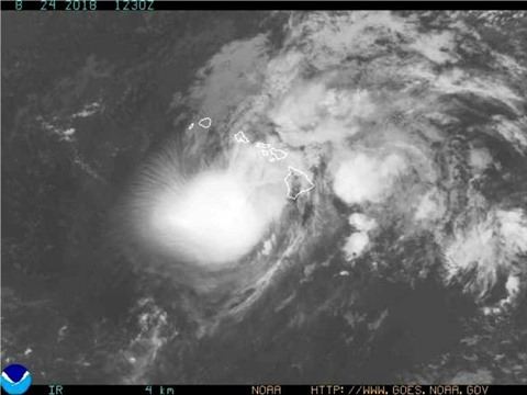 | L'ouragan Lane, alors encore en catégorie 3, photographié en infrarouge le 24 août par un satellite de la NOAA. |