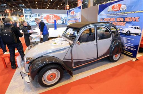 | Une vielle 2 CV exposée au salon Rétromobile, à la Porte de Versailles, près de Paris, le 5 février |