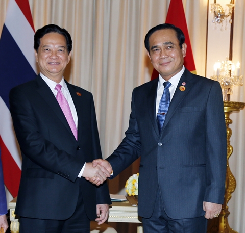| Le Premier ministre Nguyên Tân Dung (gauche) et son homologue thaïlandais Prayut Chan-ocha, le 23 juillet en Thaïlande |