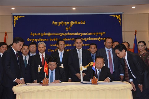 | Le ministre vietnamien du Plan et de l’Investissement, Nguyên Chi Dung (gauche), et le ministre cambodgien du Plan, Chhay Than, signent le procès verbal de la réunion. |